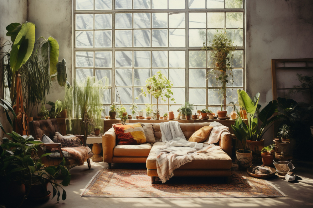 Letakkan monstera, peace lily, atau snake plant di ruang tamu dan kamar, gunakan pot tanah liat atau keranjang rotan untuk kesan alami.